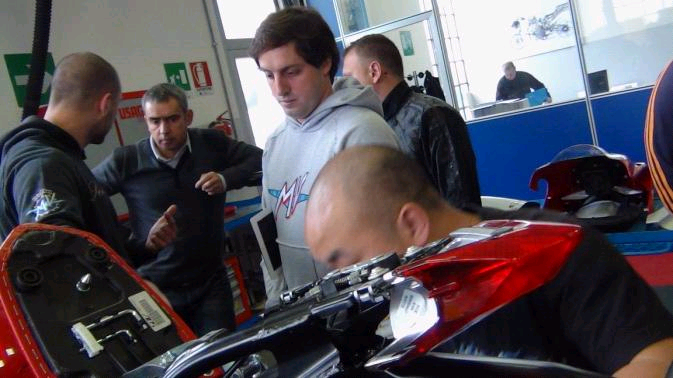 4月16号和17号MV Agusta在意大利工厂内举行了为期两天的专业技术培训。培训内容围绕新推出车型F3 675展开,包括产品状态、电路系统和后期维护。培训由MV总部主持,由意大利高级工程师全程讲解并示范拆卸装配过程。